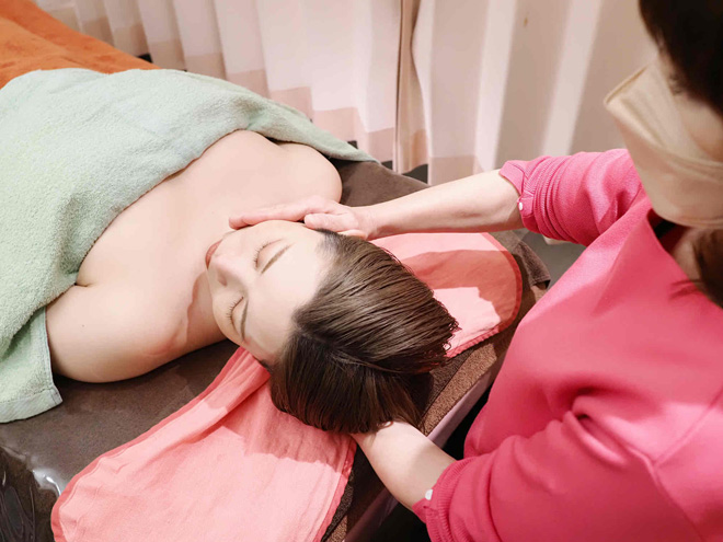肩→首→背中→デコルテ→わきの下→腕までリンパを流し、オイルマッサージします。